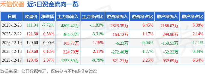 证券之星消息,截至2025年12月23日收盘,禾信仪器(688622)报收于111.94元,下跌7.72%,换手率5.2%,成交量3.67万手,成交额4.07亿元。