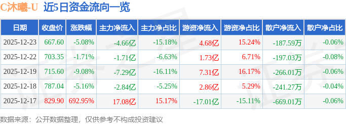 证券之星消息,截至2025年12月23日收盘,C沐曦(688802)报收于667.6元,下跌5.08%,换手率25.06%,成交量4.55万手,成交额30.68亿元。