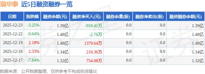 瑞华泰融资融券信息显示,融资方面,当日融资买入4075.22万元,融资偿还4985.64万元,融资净偿还910.41万元。融券方面,融券卖出0.0股,融券偿还0.0股,融券余量0.0股,融券余额0.0万元。融资融券余额1.39亿元。