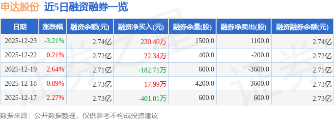 申达股份融资融券信息显示,融资方面,当日融资买入732.4万元,融资偿还502.0万元,融资净买入230.4万元。融券方面,融券卖出1200.0股,融券偿还100.0股,融券余量1500.0股,融券余额0.68万元。融资融券余额2.74亿元。