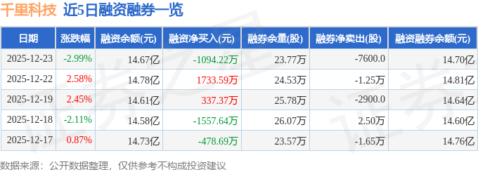 千里科技融资融券信息显示,融资方面,当日融资买入2837.88万元,融资偿还3932.1万元,融资净偿还1094.22万元。融券方面,融券卖出700.0股,融券偿还8300.0股,融券余量23.77万股,融券余额247.21万元。融资融券余额14.7亿元。