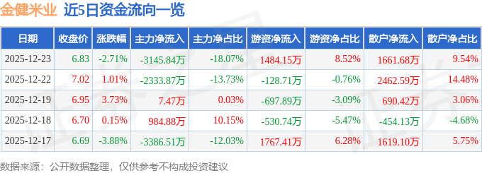 证券之星消息,截至2025年12月23日收盘,金健米业(600127)报收于6.83元,下跌2.71%,换手率3.94%,成交量25.29万手,成交额1.74亿元。