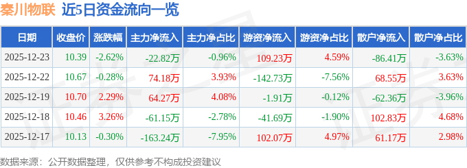 12月23日的资金流向数据方面,主力资金净流出22.82万元,占总成交额0.96%,游资资金净流入109.23万元,占总成交额4.59%,散户资金净流出86.41万元,占总成交额3.63%。
