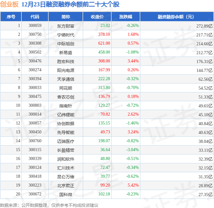 创业板融资融券余额前三分别为:东方财富(300059)融资融券余额272.89亿元、宁德时代(300750)融资融券余额217.71亿元、中际旭创(300308)融资融券余额214.66亿元,前20具体见下表: