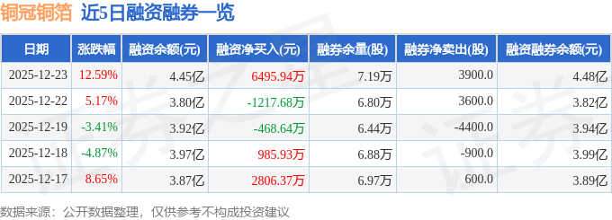 铜冠铜箔融资融券信息显示,融资方面,当日融资买入2.84亿元,融资偿还2.19亿元,融资净买入6495.94万元。融券方面,融券卖出7200.0股,融券偿还3300.0股,融券余量7.19万股,融券余额260.42万元。融资融券余额4.48亿元。