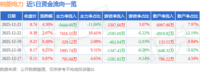 证券之星消息,截至2025年12月23日收盘,皖能电力(000543)报收于8.74元,上涨4.3%,换手率3.86%,成交量87.41万手,成交额7.65亿元。