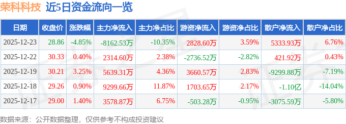 证券之星消息,截至2025年12月23日收盘,荣科科技(300290)报收于28.86元,下跌4.85%,换手率4.21%,成交量26.95万手,成交额7.89亿元。