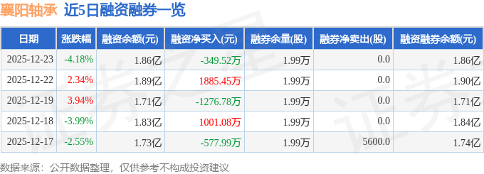 襄阳轴承融资融券信息显示,融资方面,当日融资买入4170.16万元,融资偿还4519.68万元,融资净偿还349.52万元。融券方面,融券卖出0.0股,融券偿还0.0股,融券余量1.99万股,融券余额28.32万元。融资融券余额1.86亿元。