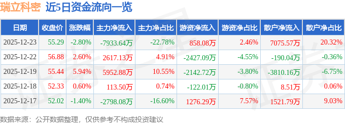 证券之星消息,截至2025年12月23日收盘,瑞立科密(001285)报收于55.29元,下跌2.8%,换手率15.3%,成交量6.22万手,成交额3.48亿元。