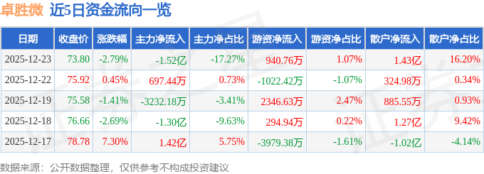 证券之星消息,截至2025年12月23日收盘,卓胜微(300782)报收于73.8元,下跌2.79%,换手率2.65%,成交量11.86万手,成交额8.8亿元。