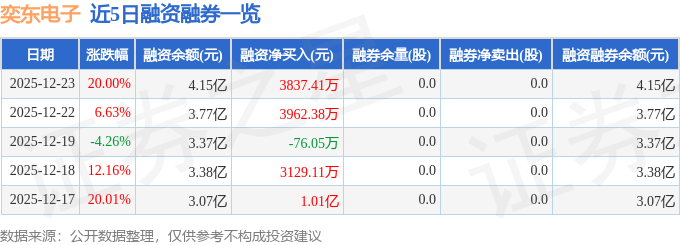 奕东电子融资融券信息显示,融资方面,当日融资买入3.03亿元,融资偿还2.65亿元,融资净买入3837.41万元。融券方面,融券卖出0.0股,融券偿还0.0股,融券余量0.0股,融券余额0.0万元。融资融券余额4.15亿元。