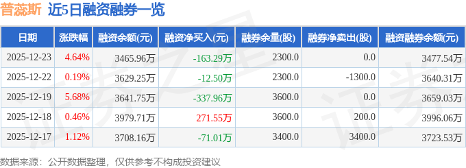 普蕊斯融资融券信息显示,融资方面,当日融资买入764.32万元,融资偿还927.6万元,融资净偿还163.29万元。融券方面,融券卖出0.0股,融券偿还0.0股,融券余量2300.0股,融券余额11.57万元。融资融券余额3477.54万元。