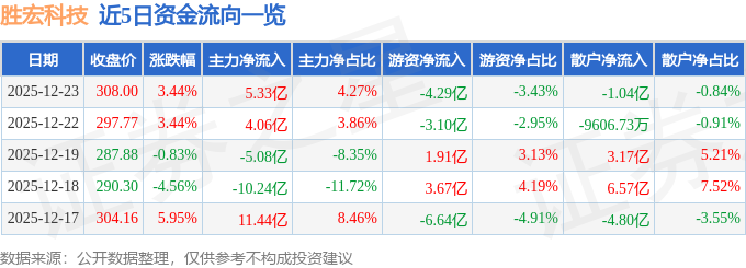 证券之星消息,截至2025年12月23日收盘,胜宏科技(300476)报收于308.0元,上涨3.44%,换手率4.73%,成交量40.47万手,成交额124.91亿元。