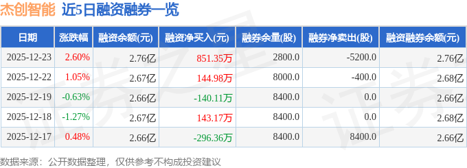 杰创智能融资融券信息显示,融资方面,当日融资买入2988.39万元,融资偿还2137.04万元,融资净买入851.35万元。融券方面,融券卖出0.0股,融券偿还5200.0股,融券余量2800.0股,融券余额8.29万元。融资融券余额2.76亿元。