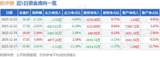 证券之星消息,截至2025年12月23日收盘,航宇微(300053)报收于16.68元,下跌5.12%,换手率14.46%,成交量94.1万手,成交额16.11亿元。