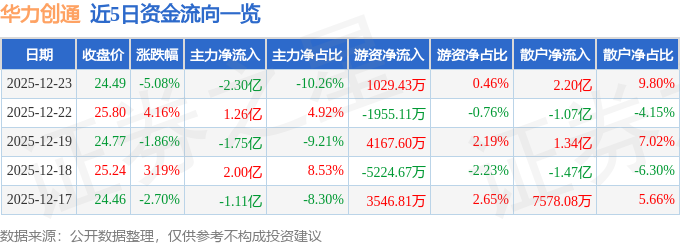 证券之星消息,截至2025年12月23日收盘,华力创通(300045)报收于24.49元,下跌5.08%,换手率17.45%,成交量90.07万手,成交额22.43亿元。