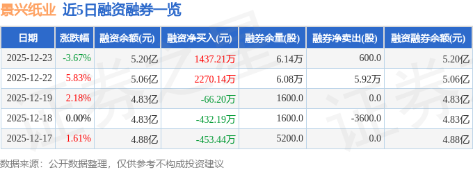 证券之星消息,截至2025年12月23日收盘,景兴纸业(002067)报收于5.25元,下跌3.67%,换手率6.87%,成交量91.88万手,成交额4.85亿元。