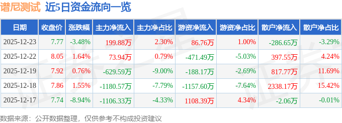 证券之星消息,截至2025年12月23日收盘,谱尼测试(300887)报收于7.77元,下跌3.48%,换手率3.06%,成交量11.09万手,成交额8701.63万元。