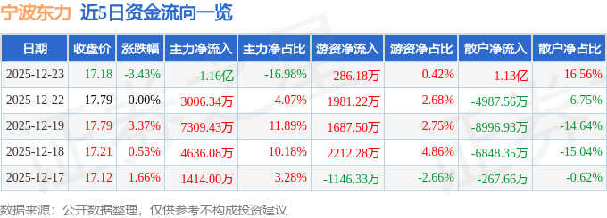 证券之星消息,截至2025年12月23日收盘,宁波东力(002164)报收于17.18元,下跌3.43%,换手率8.36%,成交量40.1万手,成交额6.85亿元。