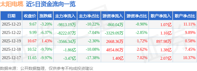 证券之星消息,截至2025年12月23日收盘,太阳电缆(002300)报收于9.67元,下跌3.2%,换手率13.49%,成交量97.4万手,成交额9.6亿元。