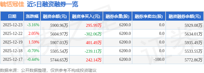 毓恬冠佳融资融券信息显示,融资方面,当日融资买入610.86万元,融资偿还314.87万元,融资净买入295.99万元。融券方面,融券卖出0.0股,融券偿还0.0股,融券余量6200.0股,融券余额28.12万元。融资融券余额5929.08万元。
