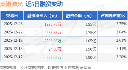 证券之星消息,12月23日,英诺激光(301021)融资买入7867.29万元,融资偿还5873.54万元,融资净买入1993.75万元,融资余额1.95亿元。