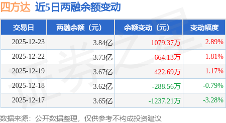 证券之星消息,12月23日,四方达(300179)融资买入1.07亿元,融资偿还9630.13万元,融资净买入1077.9万元,融资余额3.84亿元,近3个交易日已连续净买入累计2164.1万元,近20个交易日中有13个交易日出现融资净买入。