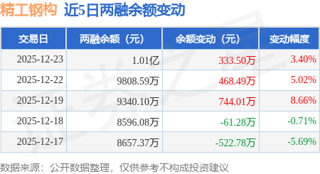 证券之星消息,12月23日,精工钢构(600496)融资买入751.27万元,融资偿还415.31万元,融资净买入335.97万元,融资余额1.01亿元,近3个交易日已连续净买入累计1548.3万元。