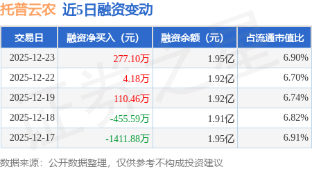 证券之星消息,12月23日,托普云农(301556)融资买入1255.5万元,融资偿还978.4万元,融资净买入277.1万元,融资余额1.95亿元,近3个交易日已连续净买入累计391.74万元,近20个交易日中有12个交易日出现融资净买入。