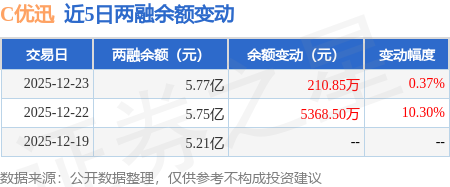 证券之星消息,12月23日,C优迅(688807)融资买入1.69亿元,融资偿还1.67亿元,融资净买入210.85万元,融资余额5.77亿元,近3个交易日已连续净买入累计5.77亿元。