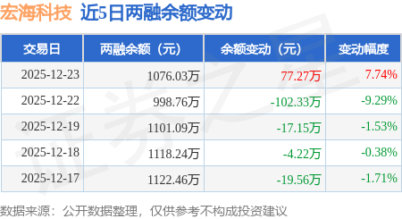证券之星消息,12月23日,宏海科技(920108)融资买入102.49万元,融资偿还25.23万元,融资净买入77.27万元,融资余额1076.03万元。
