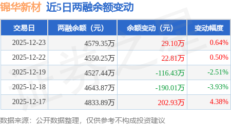 证券之星消息,12月23日,锦华新材(920015)融资买入1291.33万元,融资偿还1262.23万元,融资净买入29.1万元,融资余额4579.35万元,近20个交易日中有12个交易日出现融资净买入。