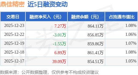 证券之星消息,12月23日,鼎佳精密(920005)融资买入26.16万元,融资偿还18.9万元,融资净买入7.27万元,融资余额864.11万元。