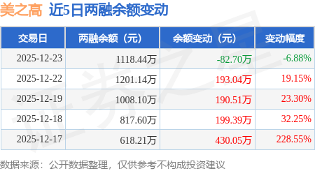 证券之星消息,12月23日,美之高(920765)融资买入210.43万元,融资偿还293.13万元,融资净卖出82.7万元,融资余额1118.44万元,近20个交易日中有14个交易日出现融资净买入。