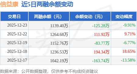 证券之星消息,12月23日,倍益康(920199)融资买入184.87万元,融资偿还310.15万元,融资净卖出125.28万元,融资余额1139.4万元,近20个交易日中有11个交易日出现融资净买入。