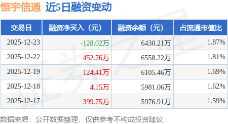 证券之星消息,12月23日,恒宇信通(300965)融资买入973.85万元,融资偿还1101.86万元,融资净卖出128.02万元,融资余额6430.21万元,近20个交易日中有12个交易日出现融资净买入。