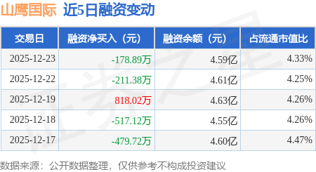 证券之星消息,12月23日,山鹰国际(600567)融资买入3067.95万元,融资偿还3246.84万元,融资净卖出178.89万元,融资余额4.59亿元。