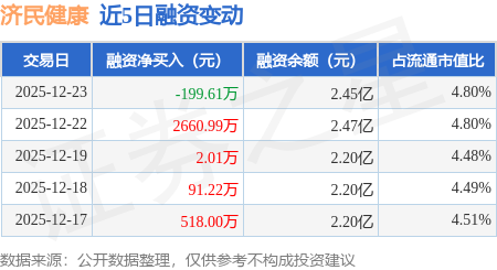 证券之星消息,12月23日,济民健康(603222)融资买入1562.79万元,融资偿还1762.39万元,融资净卖出199.61万元,融资余额2.45亿元。