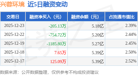 证券之星消息,12月23日,兴蓉环境(000598)融资买入1360.32万元,融资偿还1565.44万元,融资净卖出205.13万元,融资余额5.18亿元。