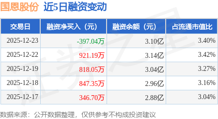 证券之星消息,12月23日,国恩股份(002768)融资买入1004.98万元,融资偿还1402.02万元,融资净卖出397.04万元,融资余额3.1亿元,近20个交易日中有11个交易日出现融资净买入。