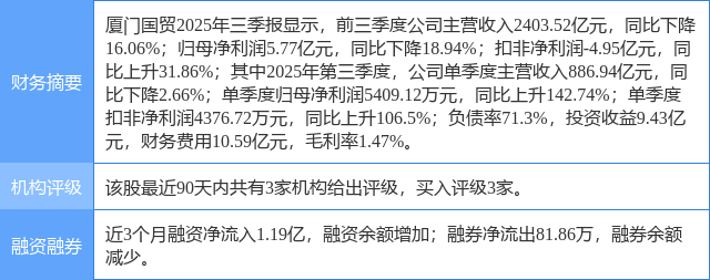 2025年11月3日,华源证券研究员孙延,刘晓宁,王惠武,曾智星,张付哲发布了对厦门国贸的研报《收入环比回升,经营逐步企稳》,该研报对厦门国贸给出“买入”评级。研报中预计公司2025-2027年归母净利润分别为8.9/12.4/15.3亿元,当前股价对应的PE分别为15.5/11.1/9.0倍。公司为国内大宗商品供应链行业龙头之一,业绩具备长期成长空间,维持“买入”评级。证券之星数据中心根据近三年发布的研报数据计算,该研报作者对此股的盈利预测准确度为16.41%。