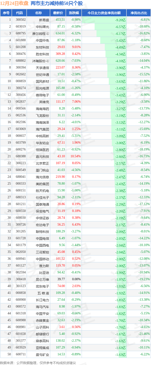 两市主力减持最多的前十只个股为: