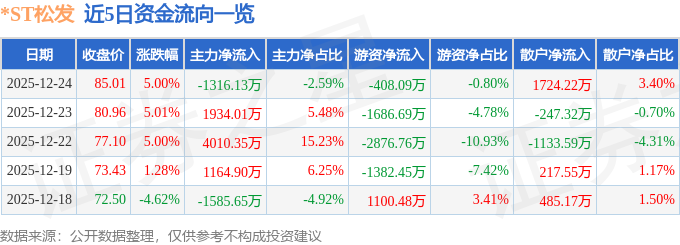 证券之星消息,截至2025年12月24日收盘,*ST松发(603268)报收于85.01元,上涨5.0%,换手率4.85%,成交量6.02万手,成交额5.08亿元。
