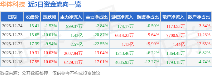 证券之星消息,截至2025年12月24日收盘,华体科技(603679)报收于15.41元,下跌1.53%,换手率13.89%,成交量22.9万手,成交额3.52亿元。