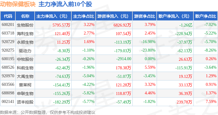 从资金流向上来看,当日动物保健板块主力资金净流入3239.89万元,游资资金净流入8740.17万元,散户资金净流出1.2亿元。动物保健板块个股资金流向见下表: