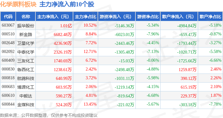 从资金流向上来看,当日化学原料板块主力资金净流出1.31亿元,游资资金净流出2380.62万元,散户资金净流入1.55亿元。化学原料板块个股资金流向见下表: