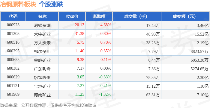 证券之星消息,12月24日冶钢原料板块较上一交易日上涨0.45%,河钢资源领涨。当日上证指数报收于3940.95,上涨0.53%。深证成指报收于13486.42,上涨0.88%。冶钢原料板块个股涨跌见下表: