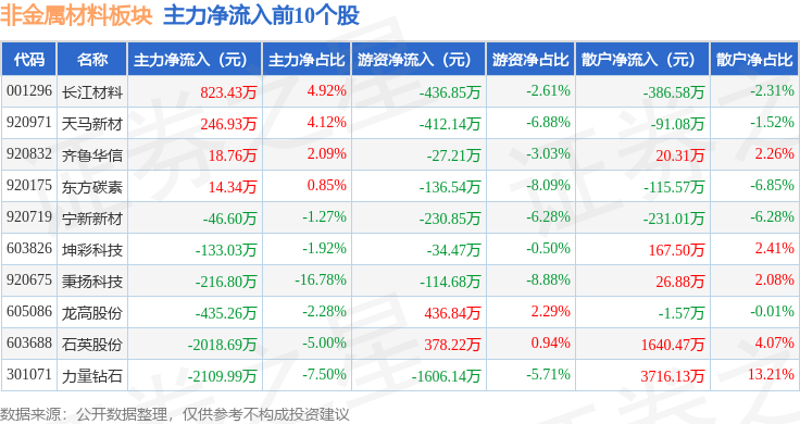 从资金流向上来看,当日非金属材料板块主力资金净流出1.51亿元,游资资金净流入4268.16万元,散户资金净流入1.09亿元。非金属材料板块个股资金流向见下表: