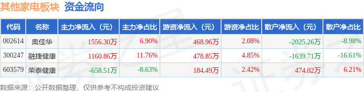 从资金流向上来看,当日其他家电板块主力资金净流入2058.65万元,游资资金净流入1132.3万元,散户资金净流出3190.95万元。其他家电板块个股资金流向见下表: