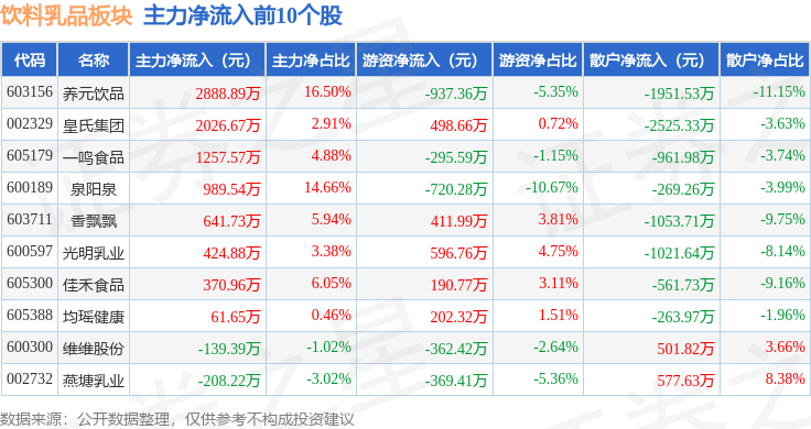 从资金流向上来看,当日饮料乳品板块主力资金净流出1.91亿元,游资资金净流出6943.37万元,散户资金净流入2.6亿元。饮料乳品板块个股资金流向见下表: